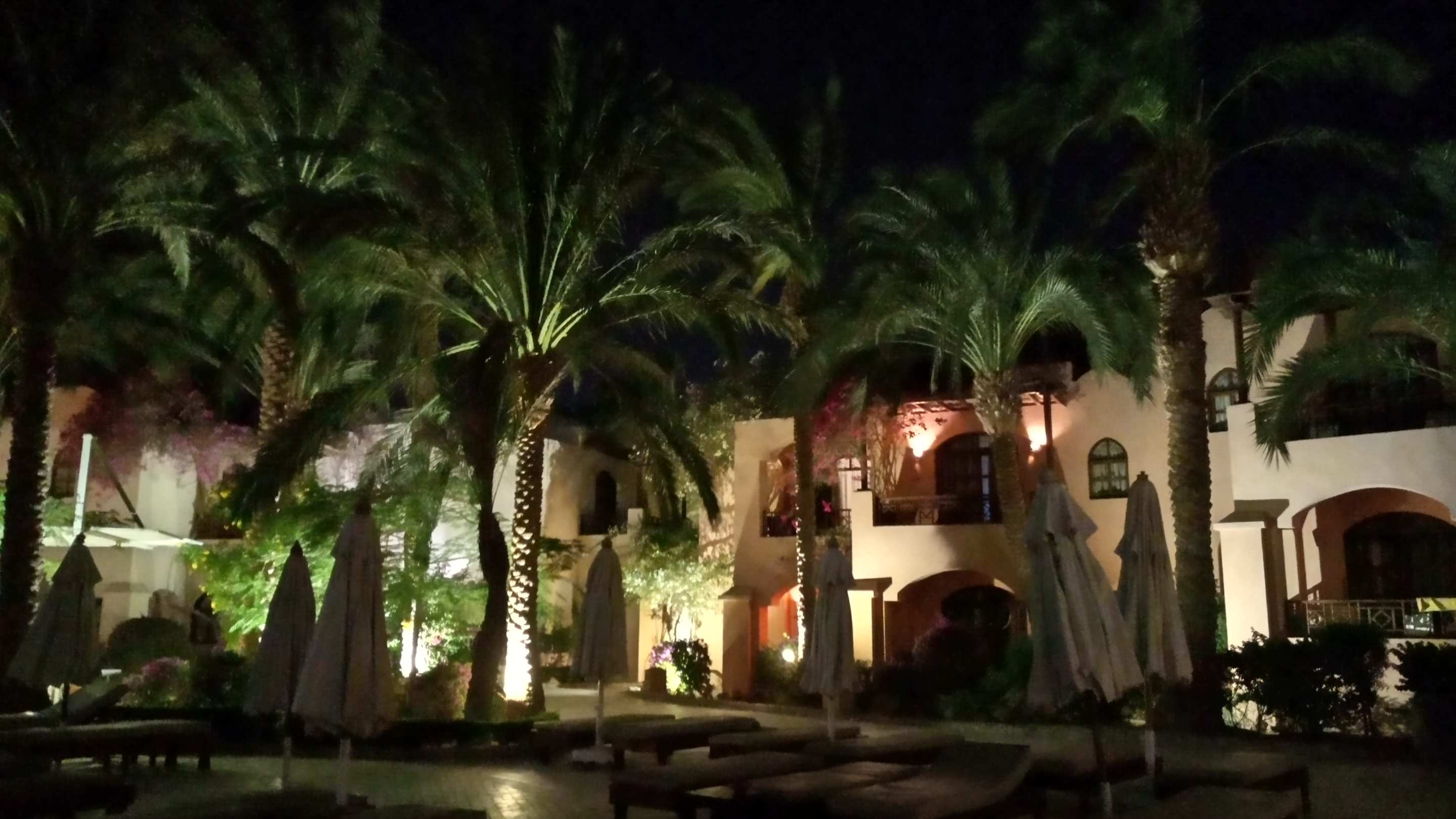 Hotelzimmergebäude am Pool bei Nacht
