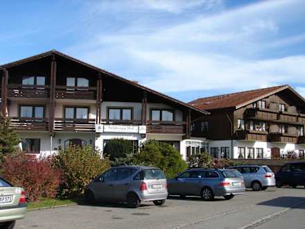 Links der Altbau, rechts der Neubau, wo oben links unser Zimmer mit Balkon war. Davor der Parkplatz. Beide Gebäude sind miteinander durch den Wintergarten verbunden.