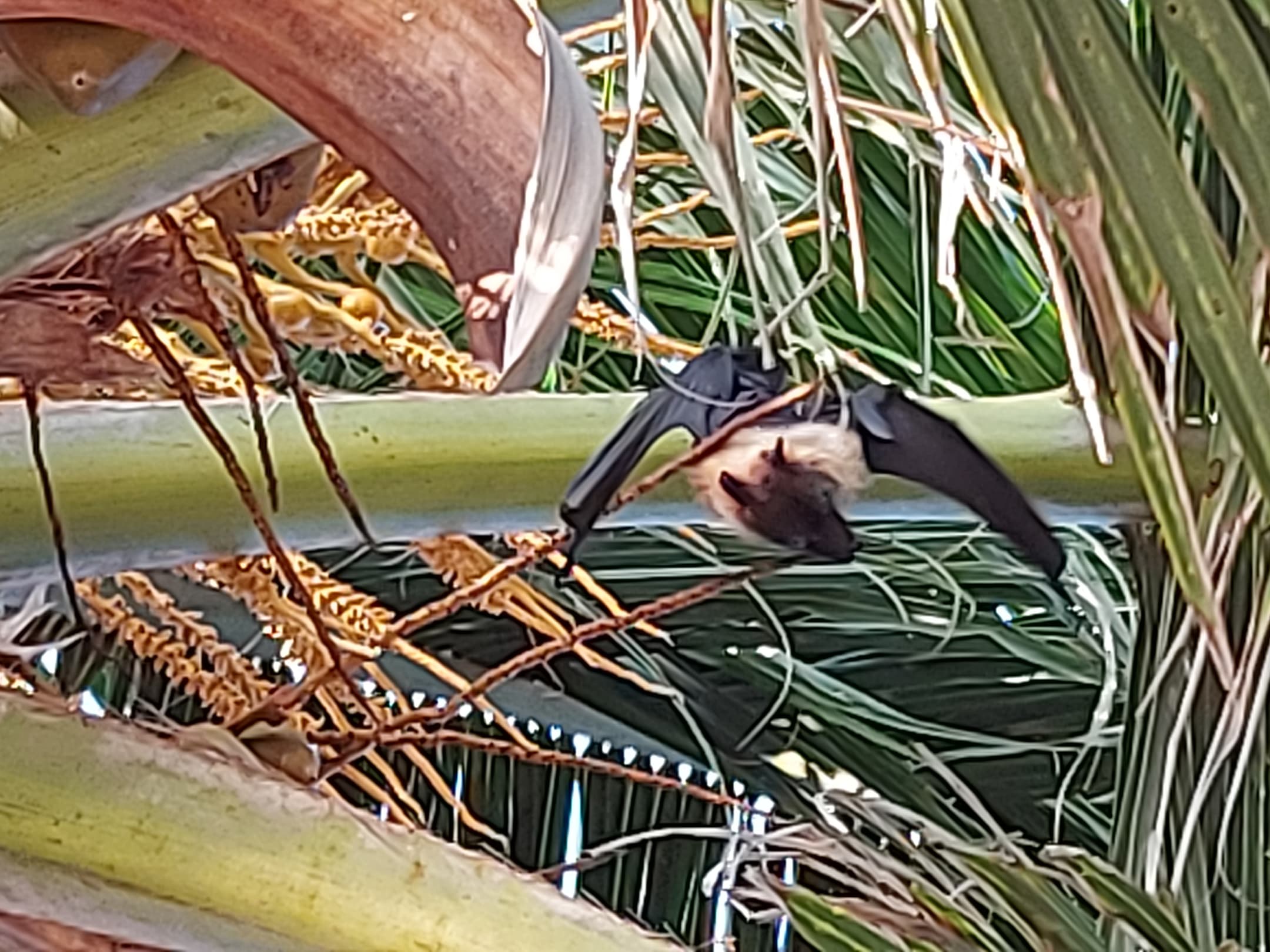 Einer der Flughunde, hat oft auf der Palme über uns gehangen