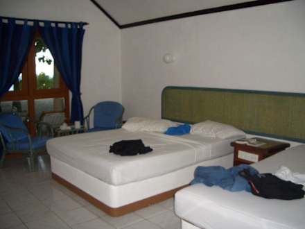 ein Doppelbett und ein Einzelbett fanden wir vor, mit Klimaanlage und Deckenventilator. Im Bad gibts eine große Dusche unter der man sogar zu dritt duschen könnte, eine Toilette und ein Waschbecken.