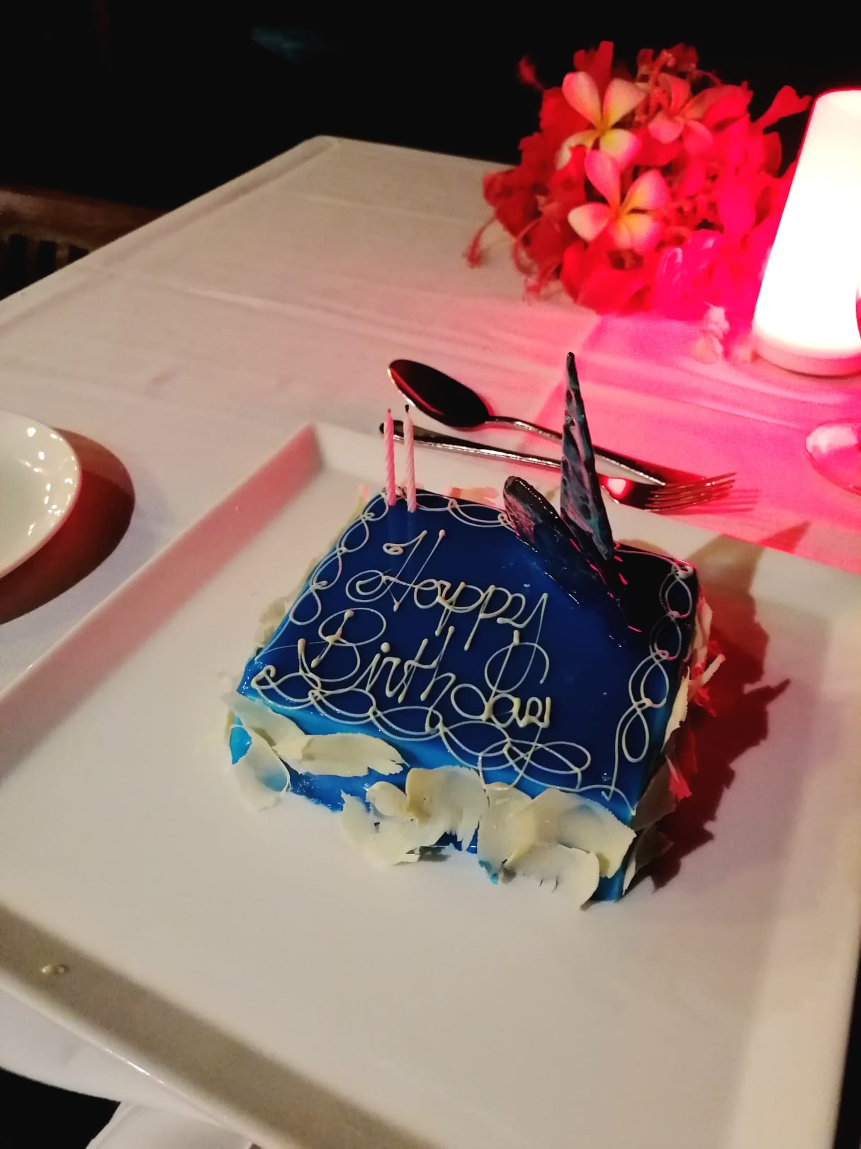 Meine Geburtstagstorte. Das war eine Überraschung. Und ein Ständchen gab es von den Kellner auch dazu