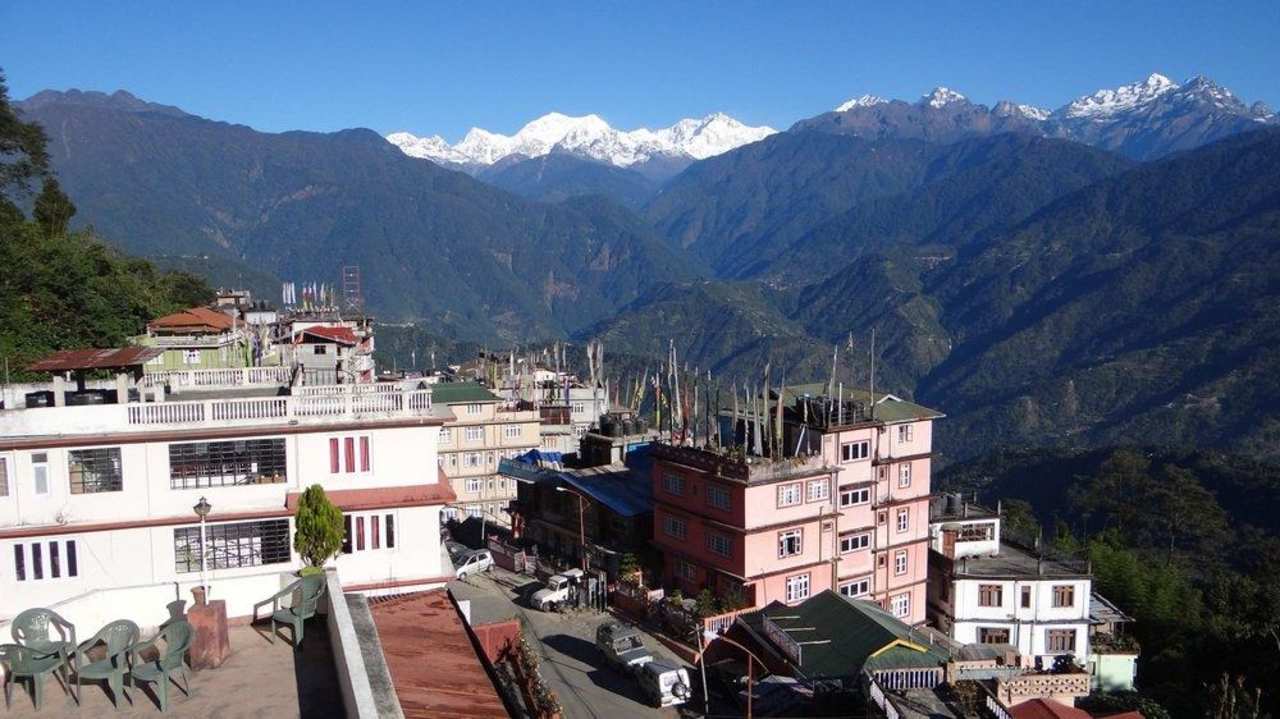 Blick von Dachterrasse auf Ort und Kangchenjunga