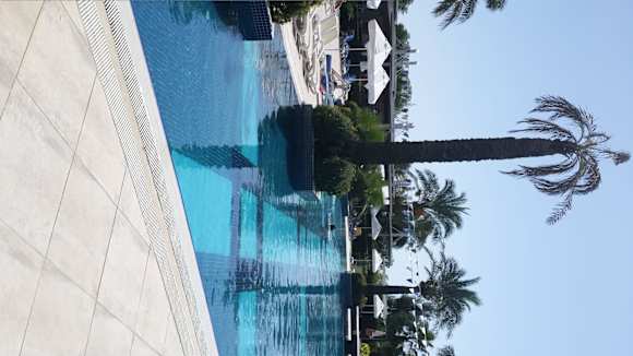 Blick auf die Poolanlage vom Steg zum Strand
