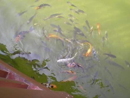 Die Koi Karpfen und Fische im kleines BächleinDie schönen und Koi Karpfen und Fische im süßen Hoteleigenen Bächlein.