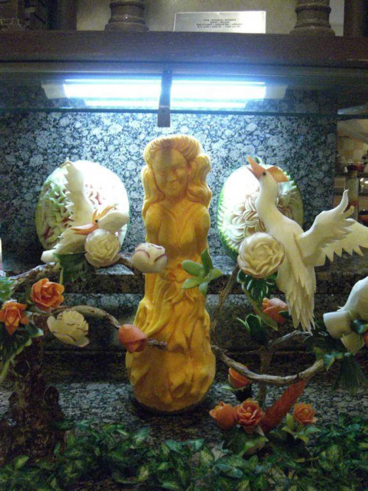 Geschnitzte Frau und Vögel