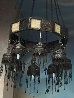 Der Kronleuchter über dem Süßspeisenbuffet mit Vogelkot