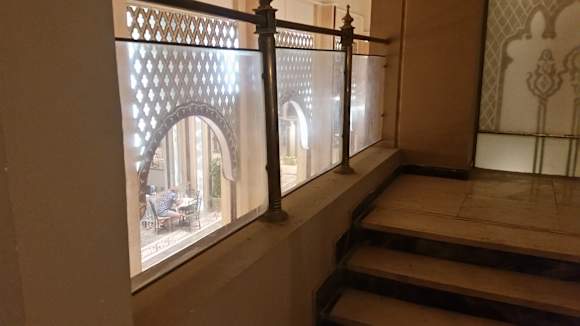 Blick durch verdreckte Glasscheiben zur Lobby