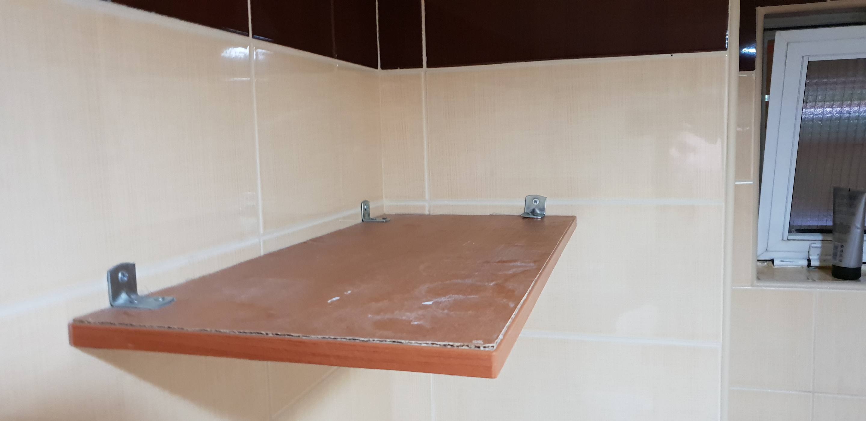 ZimmerAblage für Toilettenpapier und Reinigungsutensilien.