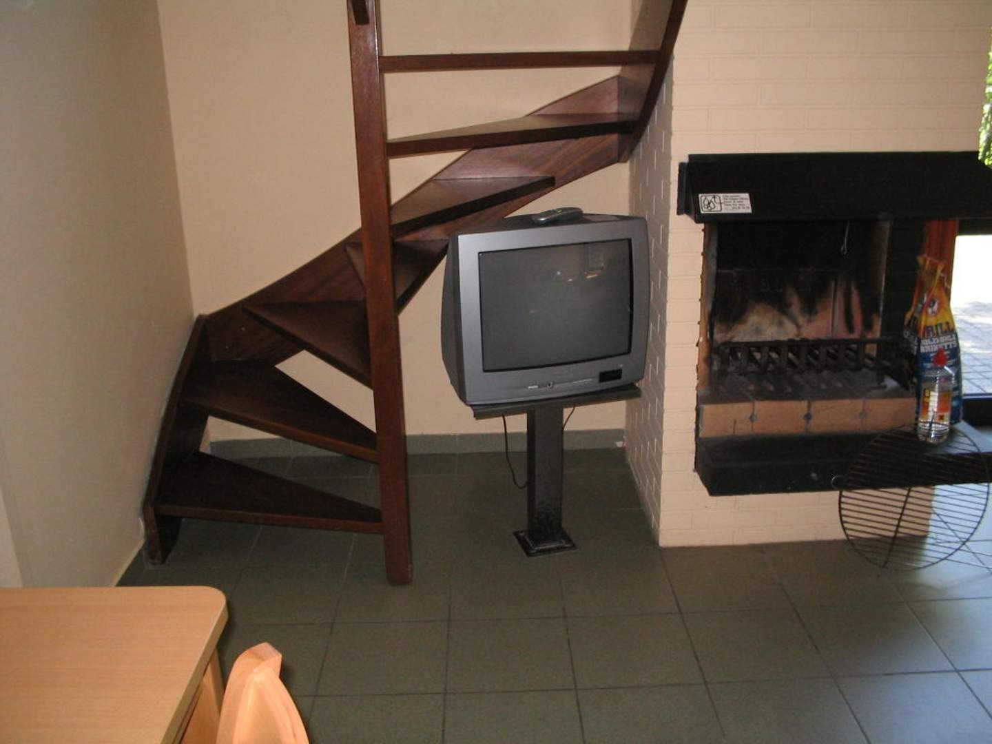 Treppe nach oben, Fernseher, Innenkamin