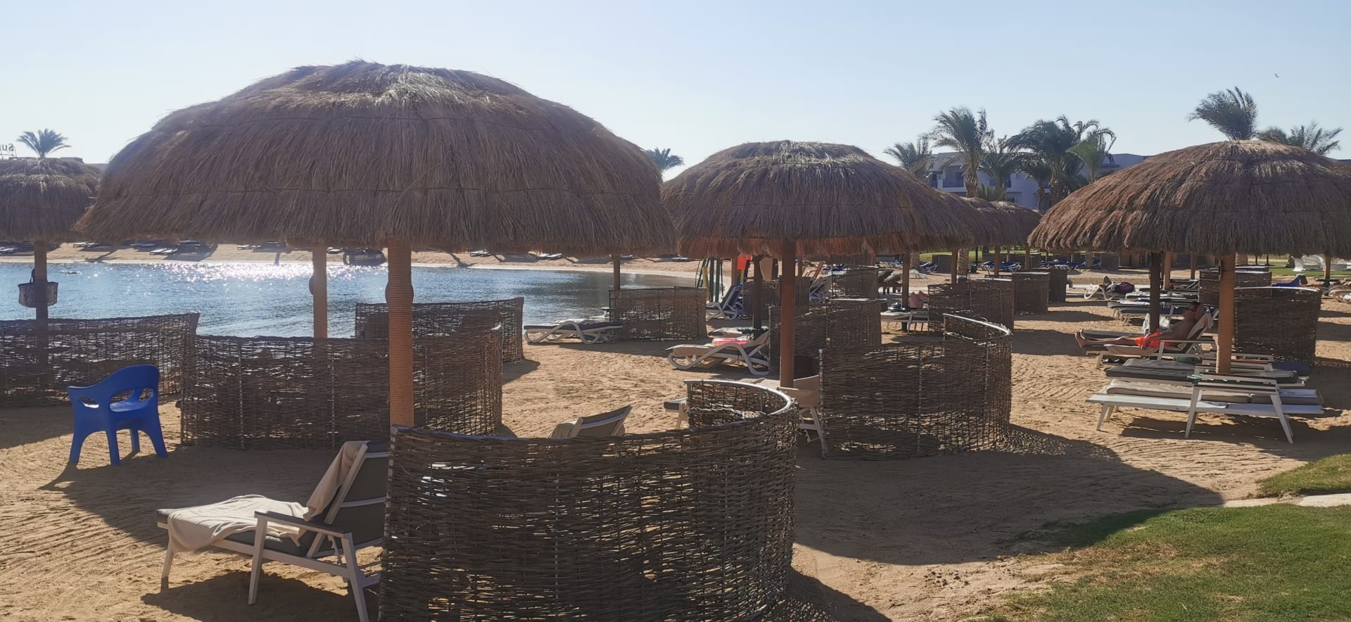 Der Strand mit Liegen und Schirmen