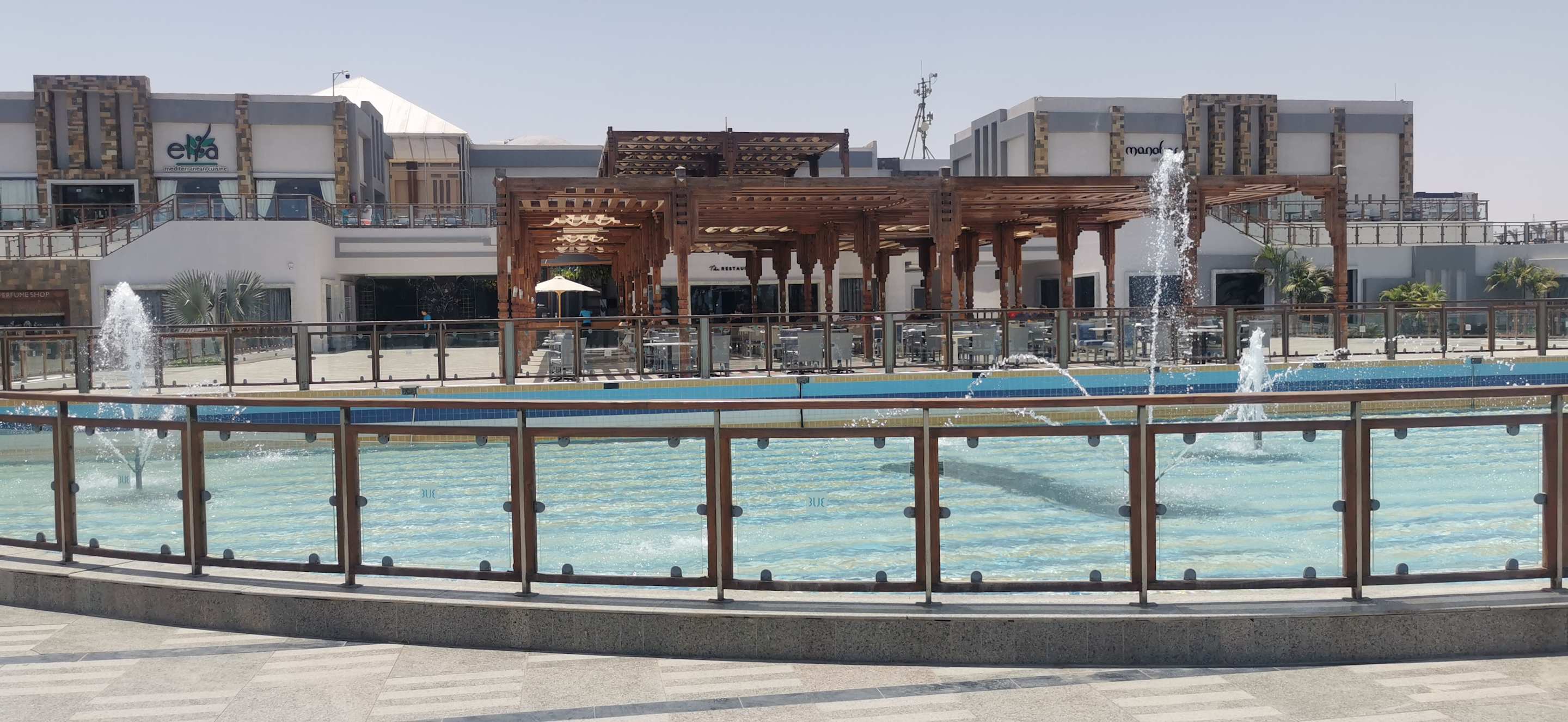 Springbrunnen vor der Außenterrasse des Mainrestaurants