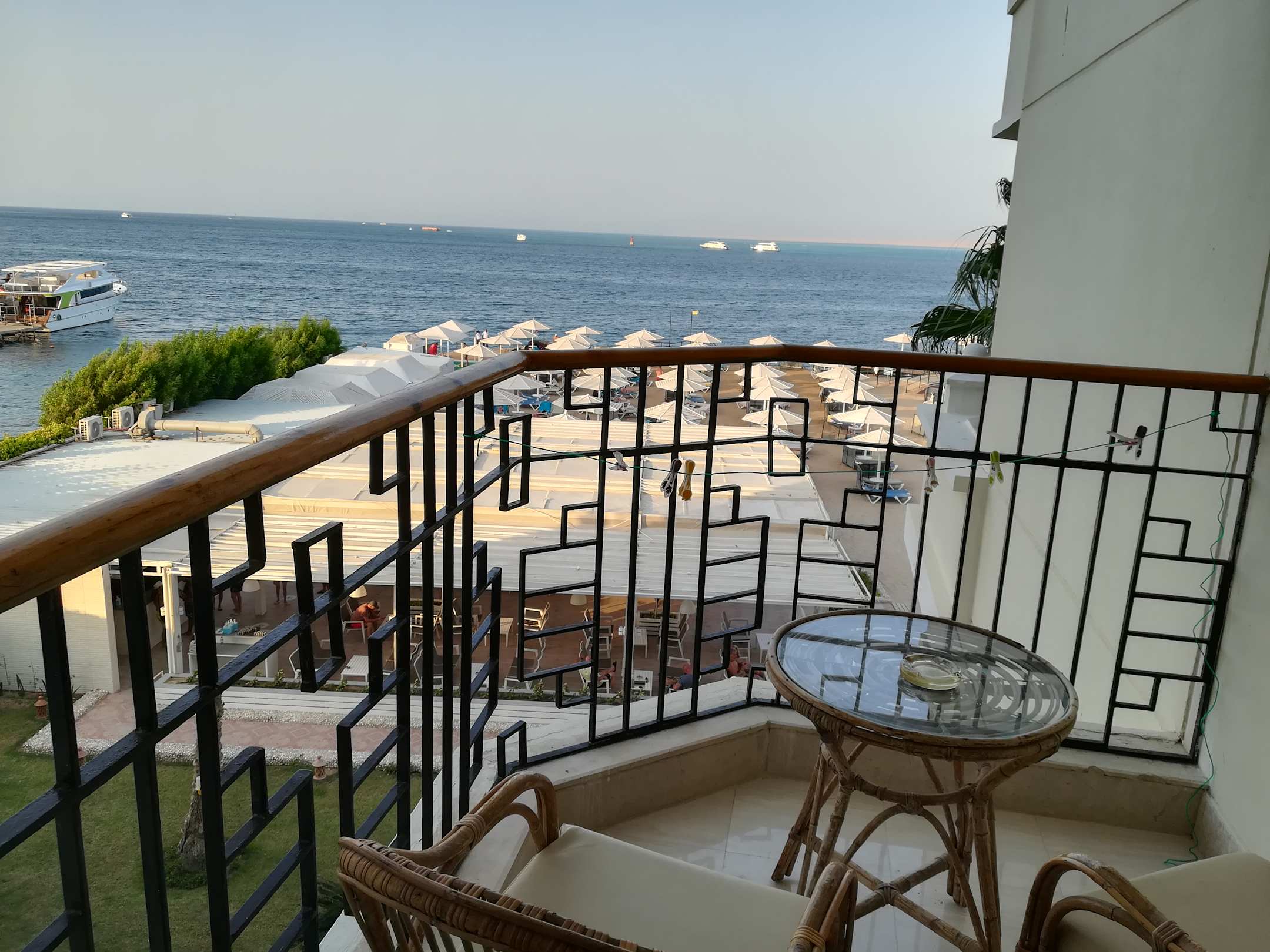 Balkonsicht vom Zimmer 410 mit verschlissenen Sitzmöbeln und schwer zu öffnenter Balkontür!!!