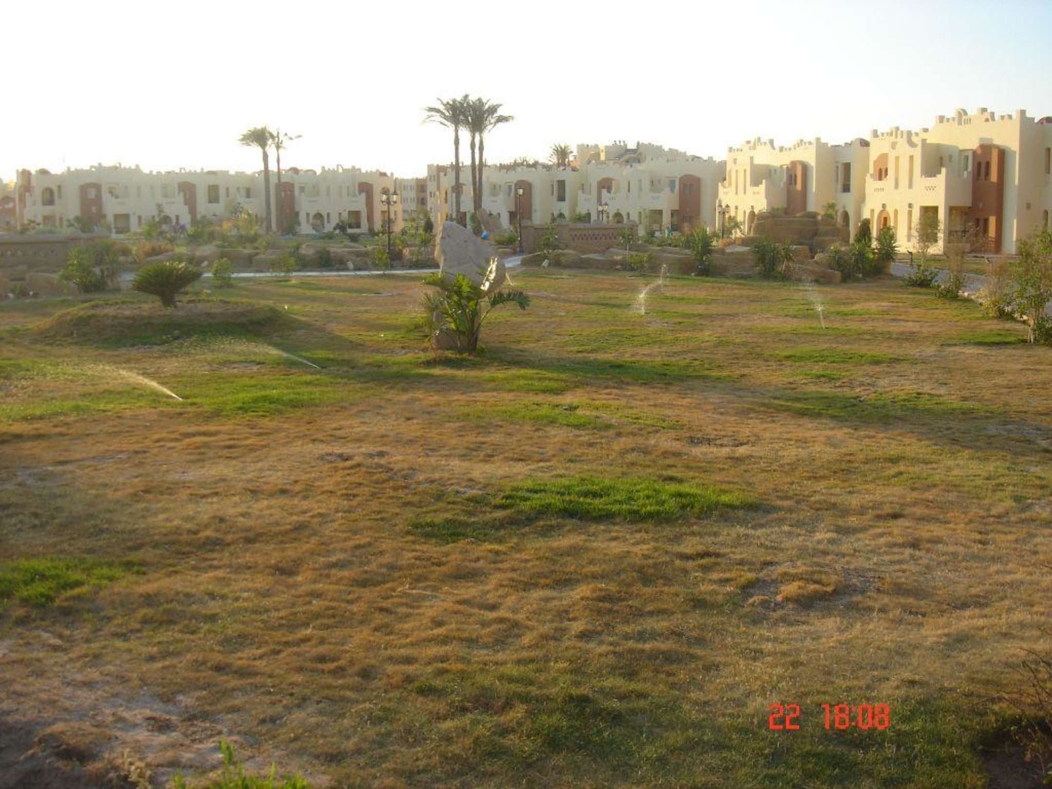 GrünanlagenHier sieht man die Grünanlagen des Hotels bei der Bewässerung um 18Uhr. Die Anlage von großen "Wiesen" ohne schattenspendende Pflanzen dazwischen scheint mir ein Planungsfehler. Vollkommen klar dass das alles austrocknet bei 40 Grad im Schatten! ;)