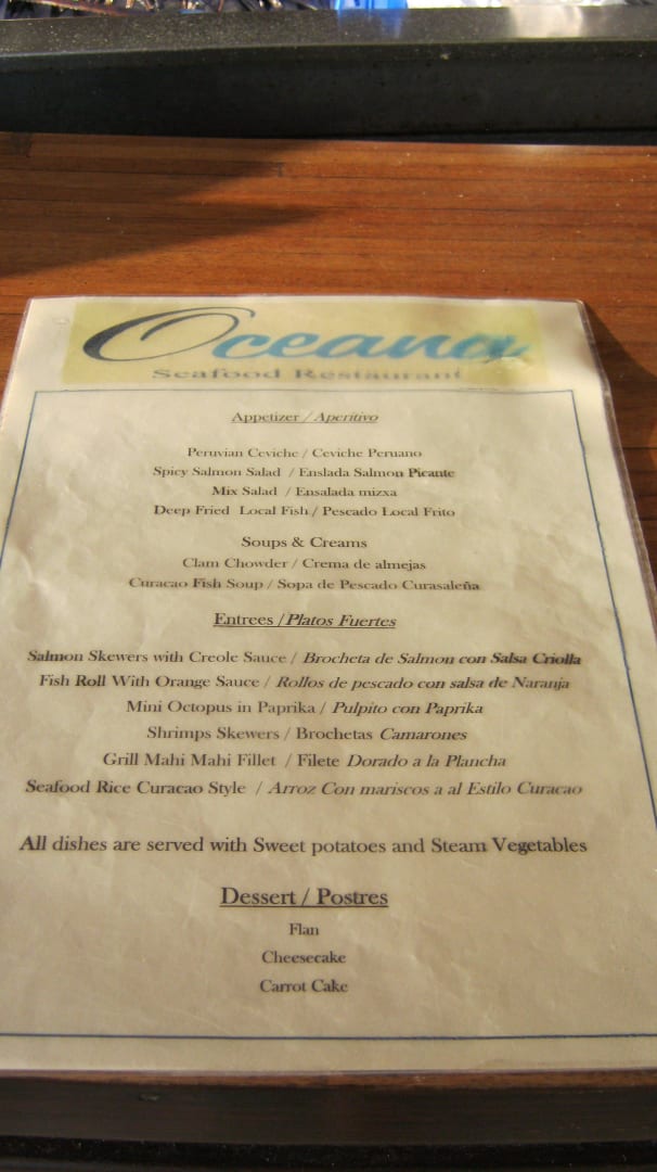 Speisekarte im "Oceana" Sunscape Curaçao Resort, Spa & Casino