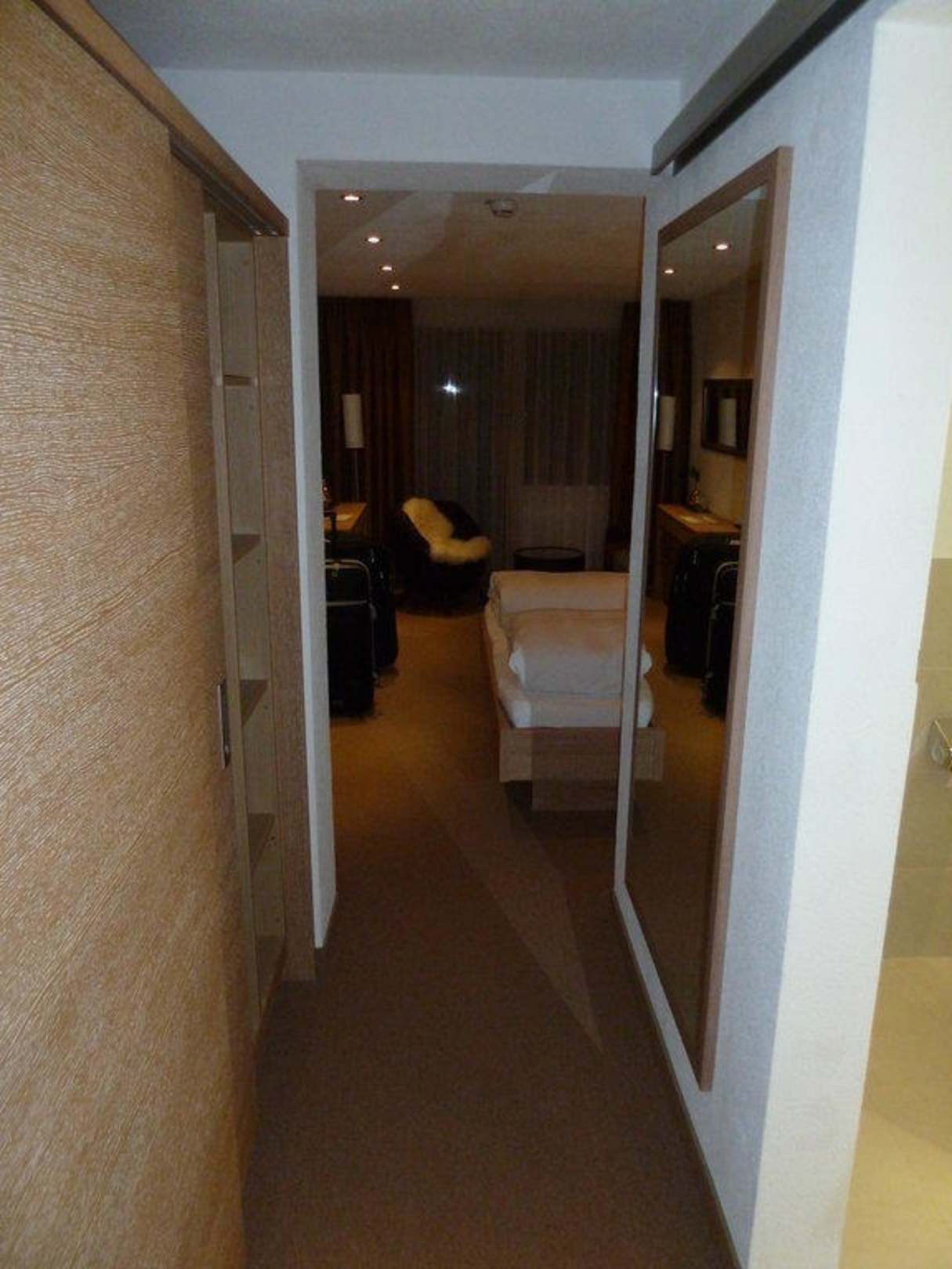 Garderobe direkt hinter der Tür, rechte Seite geht's ins Badezimmer, gegenüber der große Kleiderschrank, ihm gegenüber ein großer Wandspiegel