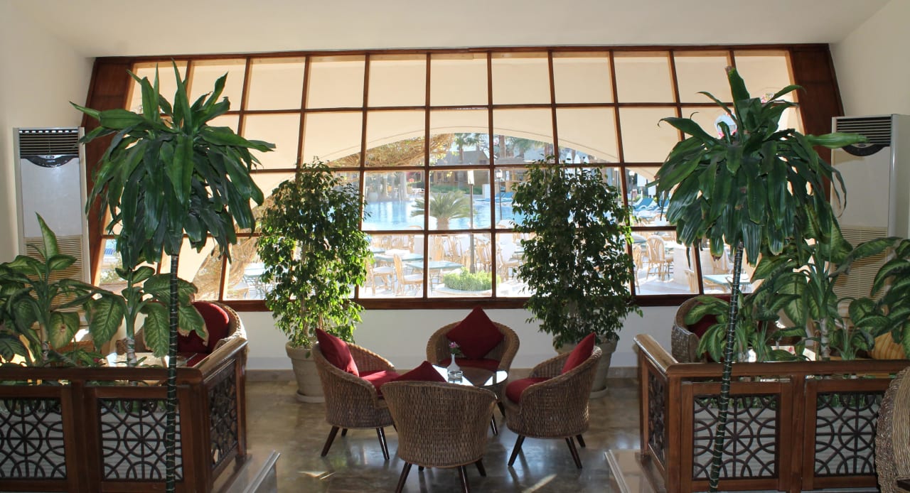 Blick von der Halle auf Pool und Poolrestaurant
