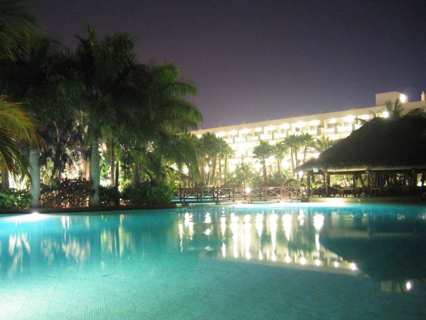 Pool bei Nacht mit Snackbar und dem beleuchtetem Tabaiba Princess