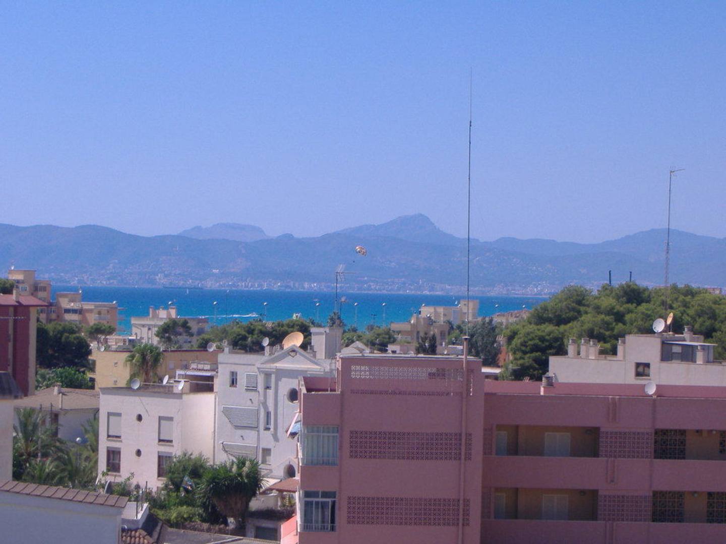 Zdjęcie przedstawia widok z balkonu hotelowego. Panorama miasta, morze i góry to widoki jakie można podziwiać każdego ranka po wstaniu z łóżka... aż chce się obudzić.