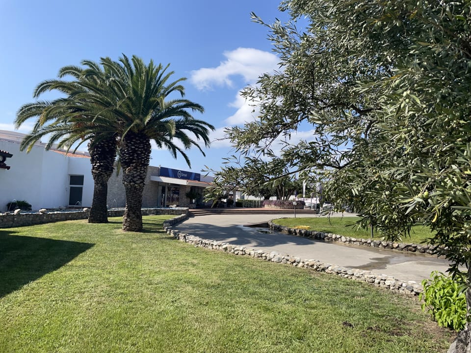 Blick von den Bungslows auf das Rezeptionsgebäude