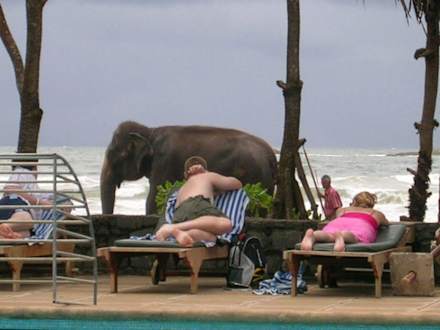 Elefant am StrandDa hat es beim Urlauber aber einen großen Schrecken gegeben, als der Elefant seinen Rüssel über die niedrige Mauer streckte!