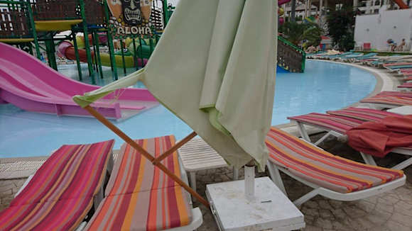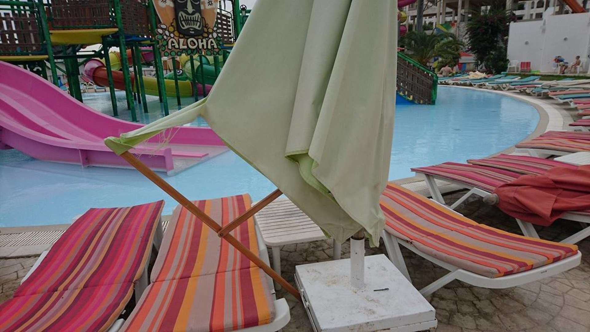 Liegen und Schirme im Aquapark