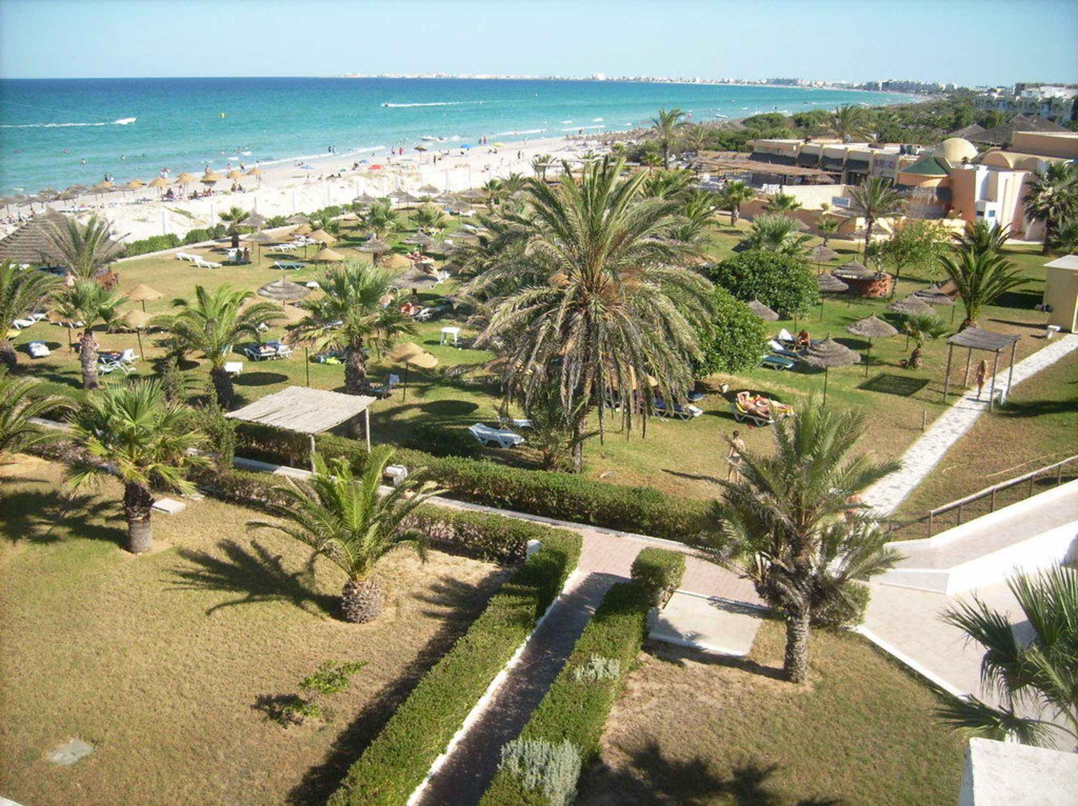 Liegewiese und StrandAusblick über die Grünanlage zum Strand. Rechts neben der Liegewiese ging es zum Pool.