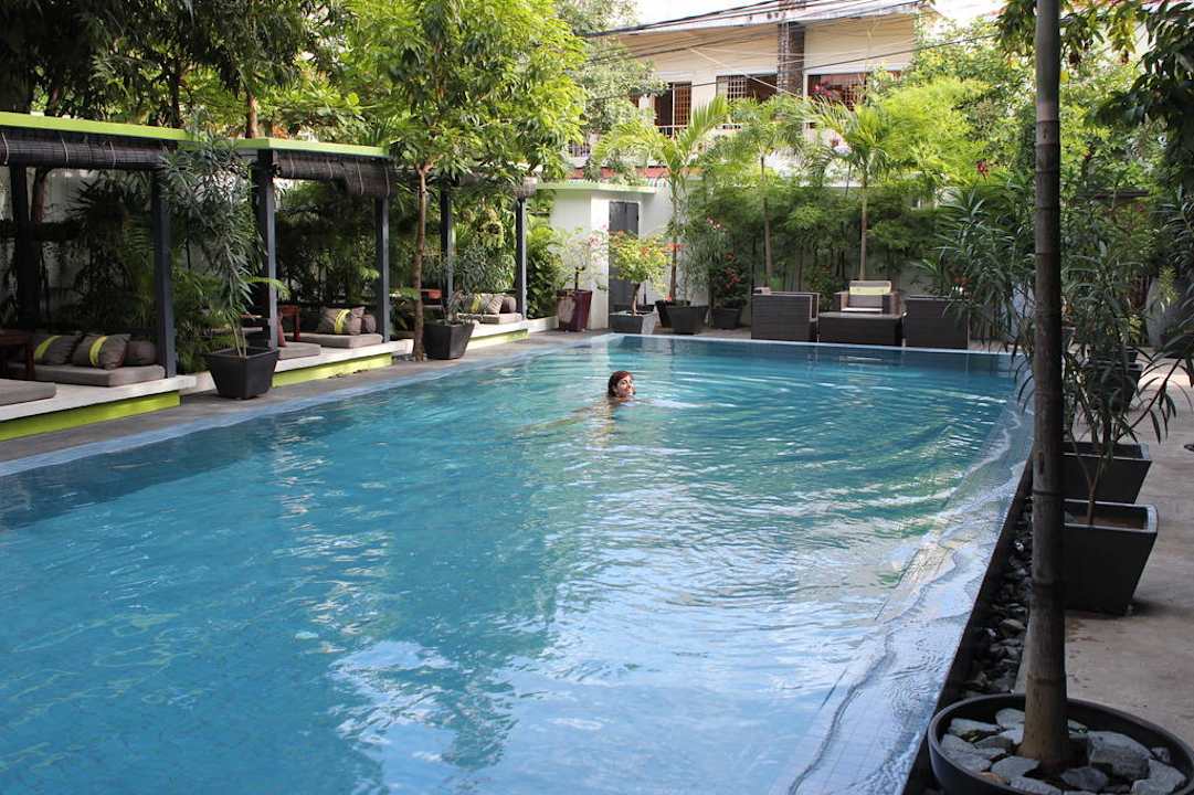 Piscina, con confortables tumbonas y bastante sombra. El restaurante queda al lado.