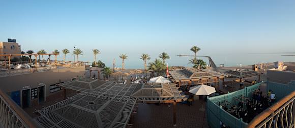Blick von Dachterrasse des Breakers. Rechts: Tauchbasis