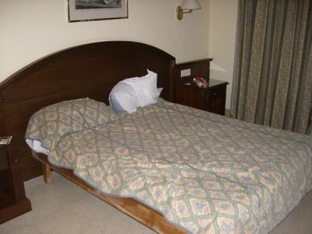 Bett Das Bett ist ein Holzgestell, darauf liegt eine Matratze. Die Matratze ist mit einem Laken bezogen, das leicht verrutscht. Über dem Laken liegt ein weiteres Laken als Decke, ein Plumeau gibt es nicht. Oben drauf leigt dann die Tagesdecke, damit das ganze nicht so schlimm aussieht.