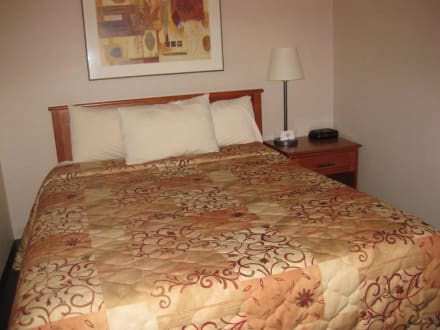 Blick aufs BettEtwas ungewöhnliche Zimmeraufteilung, wenig Platz im Schlafzimmer, Tür auf und man steht vor dem Bett, dafür mehr Platz im Wohnbereich