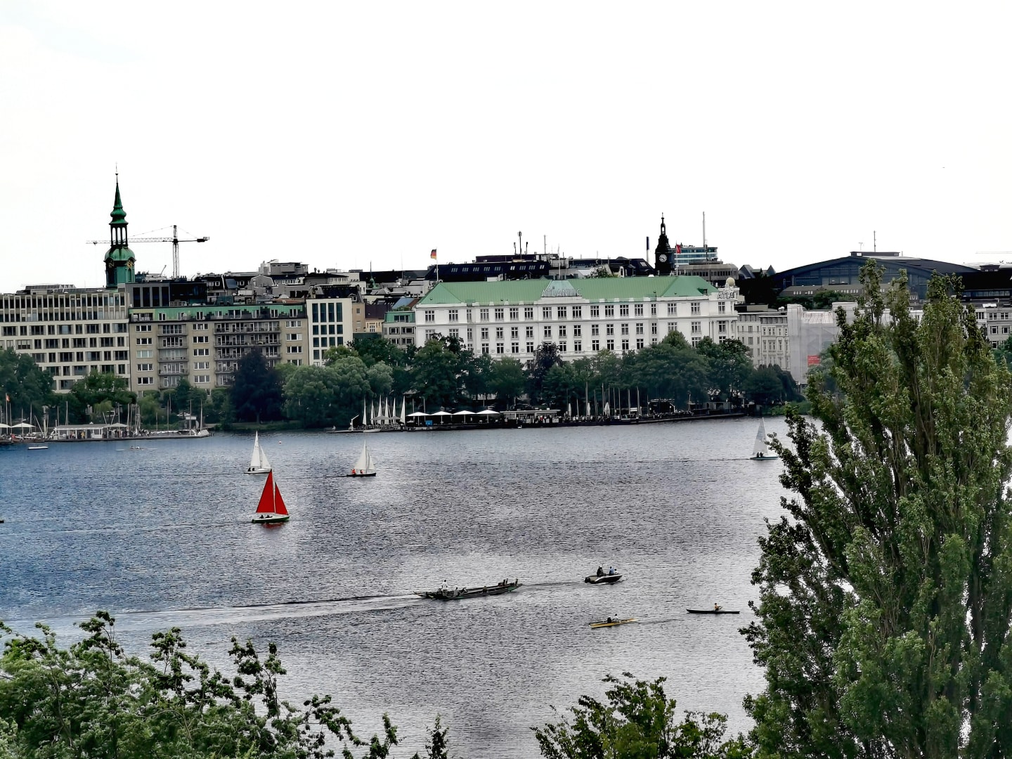Ausblick von der Dachterrasse über die Außenalster zum Hotel Atlantic.