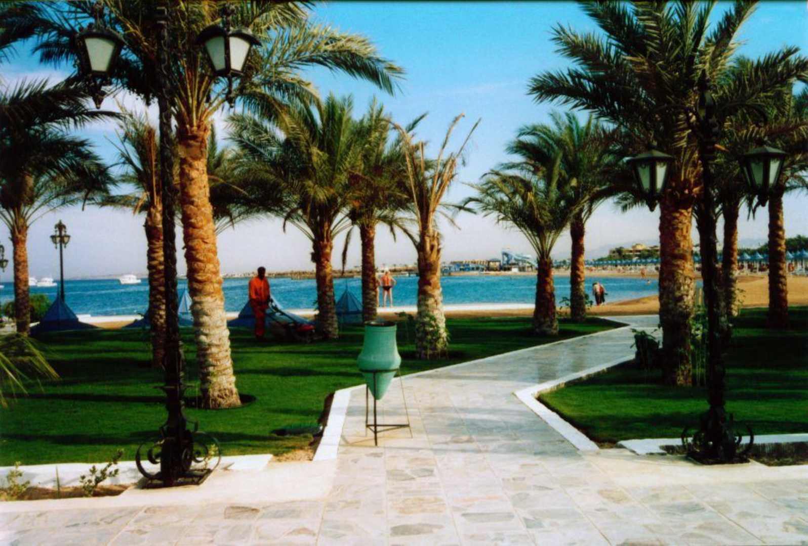 GartenBlick vom nördlichen Ende in Richtung Strandabschnitt. Auch abends sind noch fleisige Mitarbeiter im Garten unterwegs.