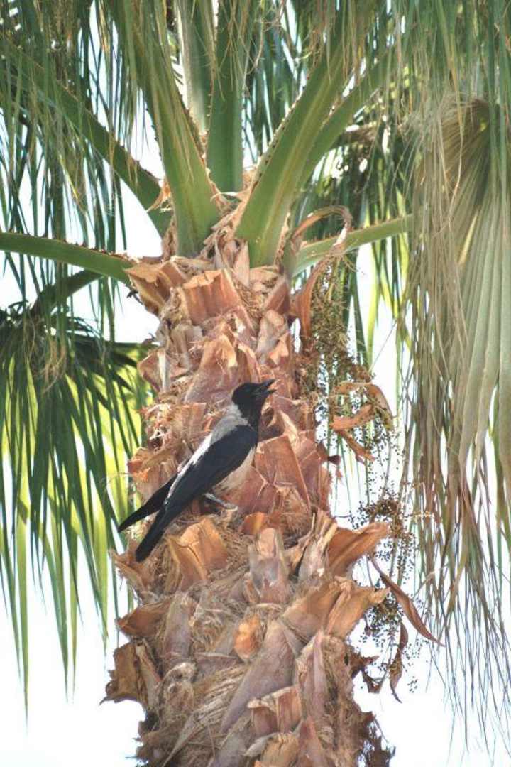 schatten suchender Vogel an einer Palme