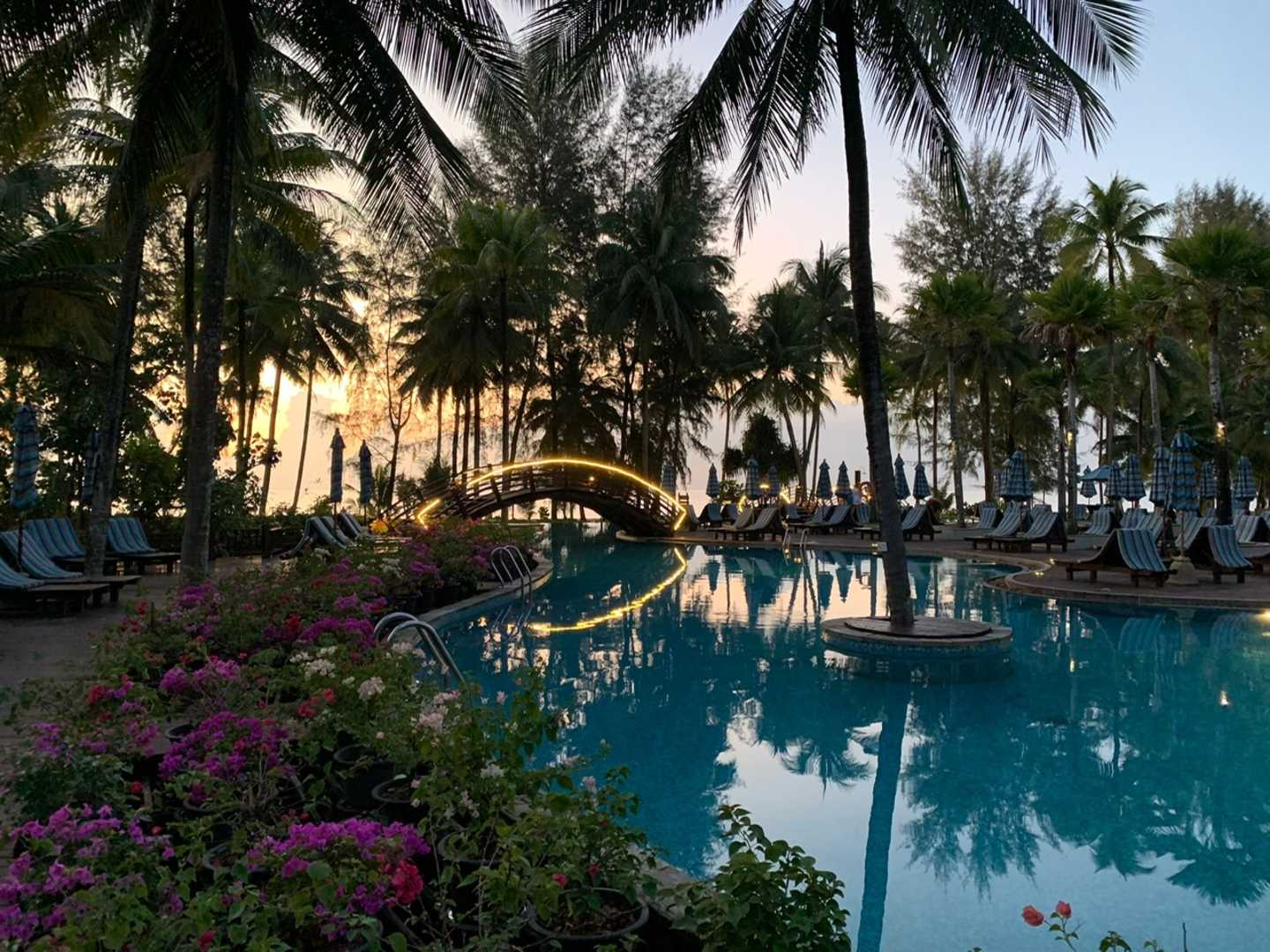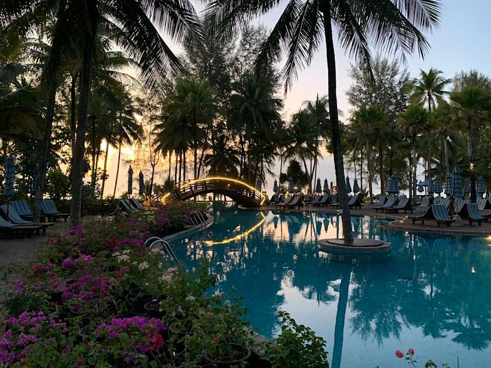 Poolanlage mit kleinen Brücken rüber zum Strand