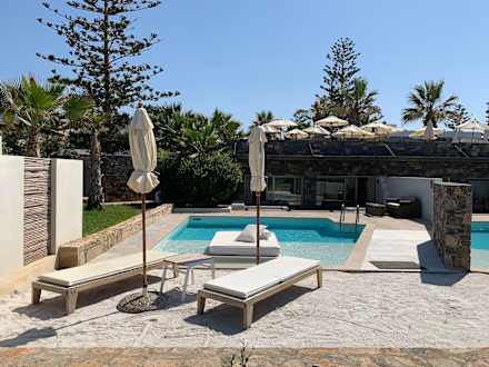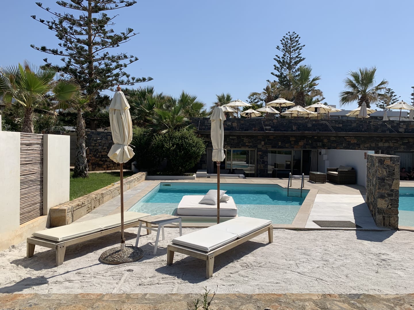 Privater Pool mit Liegen, Sonnenschirmen und Sonnenbett