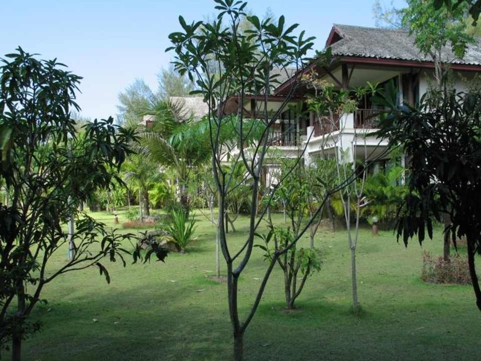 Die Bungalows liegen alle rund um die grüne Gartenanlage.