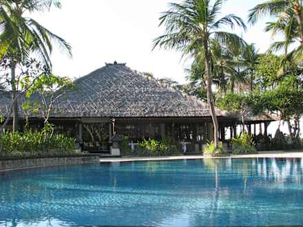 Hauptpool mit Blick zum Strandrestaurant