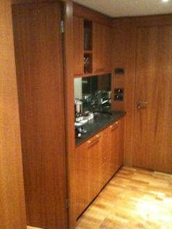Kleine Kochnische mit Kaffeemaschine, Gläsern und Kühlschrank/Minibar.
