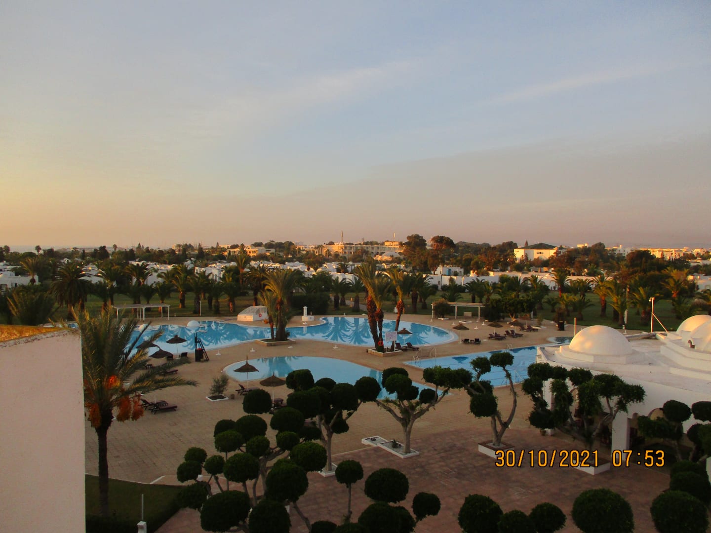 Ausblick auf die Anlage mit Pool und im weiteren Verlauf die Bungalows.