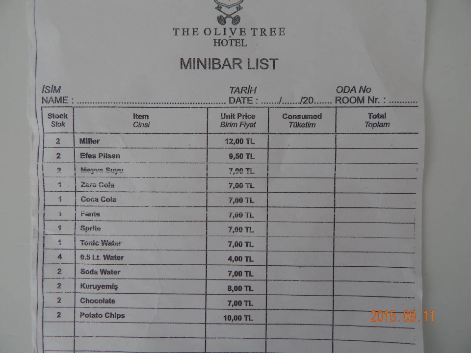 Minibar prices