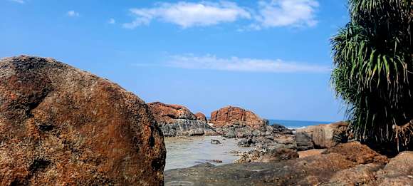 Umgebung (mit dem Rücken zum Hotel nach links bis zum Ende des Strandes. Dort kann man mit einem Boot auf die Felseninsel gebracht werden). Lohnenswert
