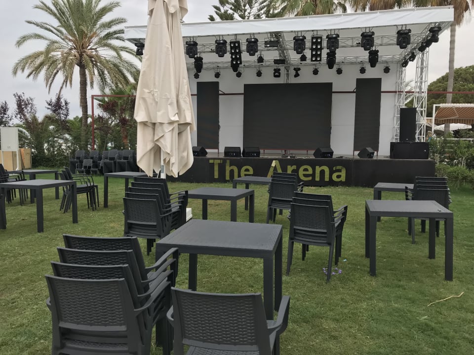 Gartenbereich im Nebengebäude am Strand. Moderne Musikbühne.