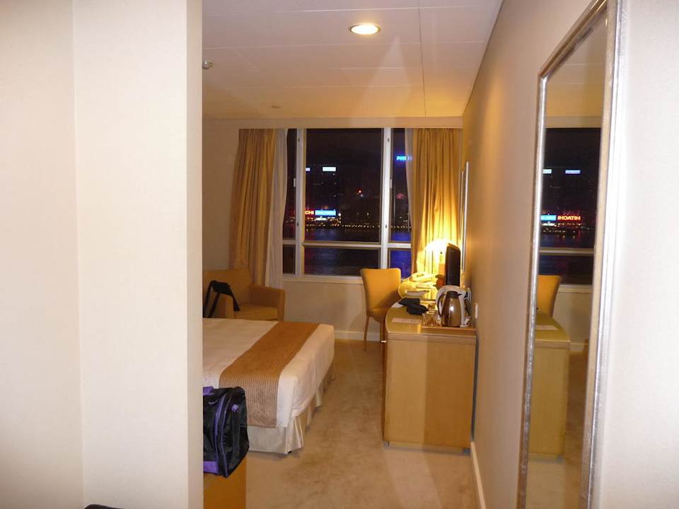 Eingangsbereich mit Blick ins ZimmerIm Eingangsbereich ist ein großer Spiegel; im Hintergrund Bett mit dem Panoramafenster.