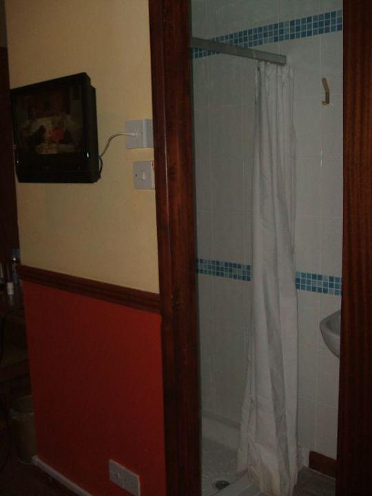 TV an der Wand neben dem "Badezimmer"