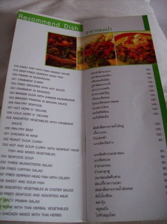 Auszug Speisekarte des Restaurants im Viang Tak
