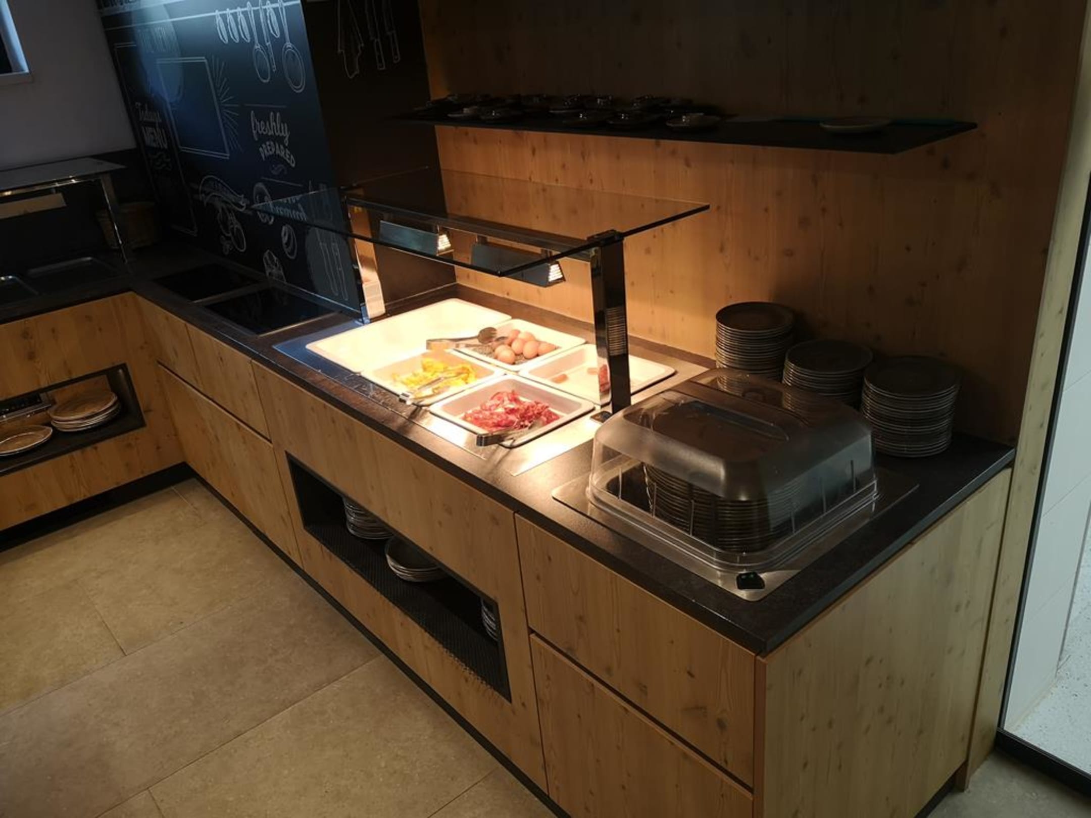 Frühstück: Rührei, Ei, Speck.