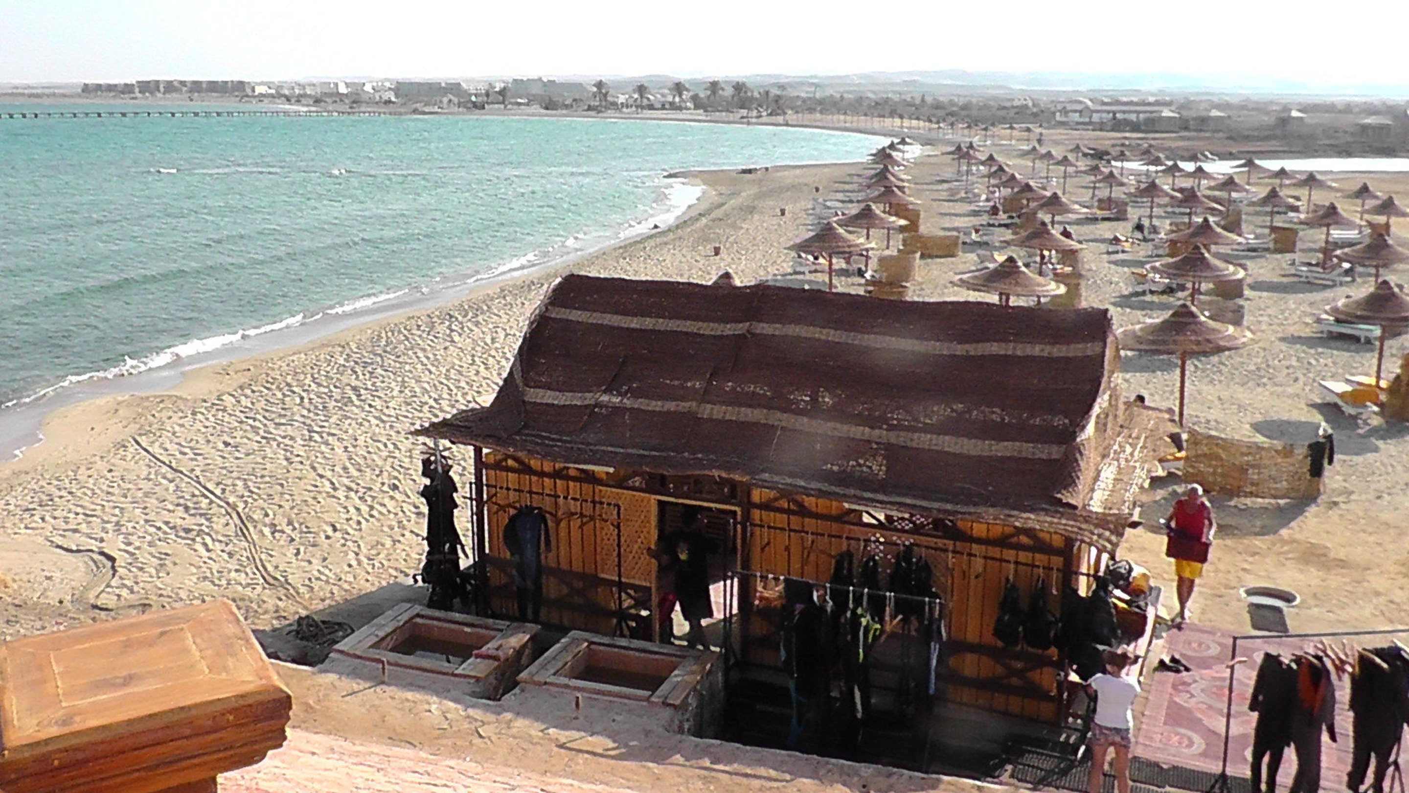 Strand mit Ausrüstungshütte der Tauchbasis