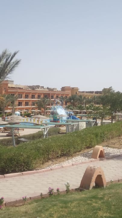 Blick auf den Pool und die Wasserspiele