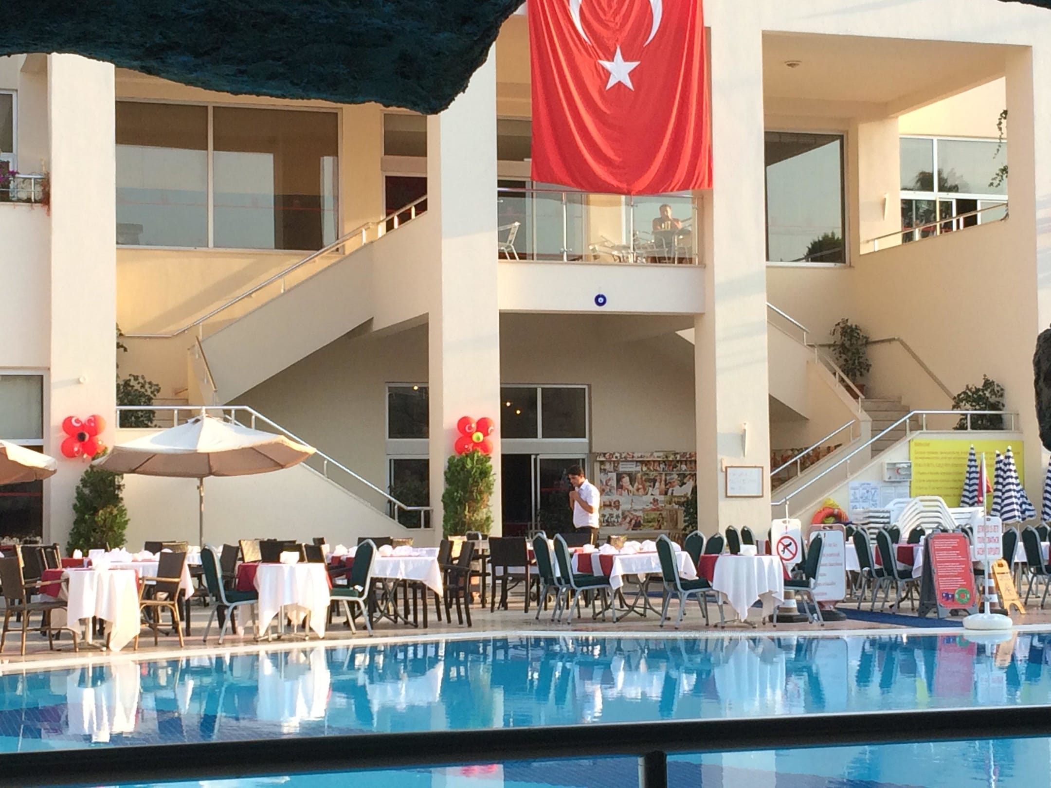 Вид из бара через бассейн на вход в отель