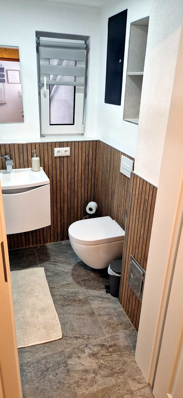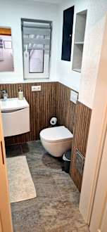 Badezimmer mit großer ebenerdiger Dusche.